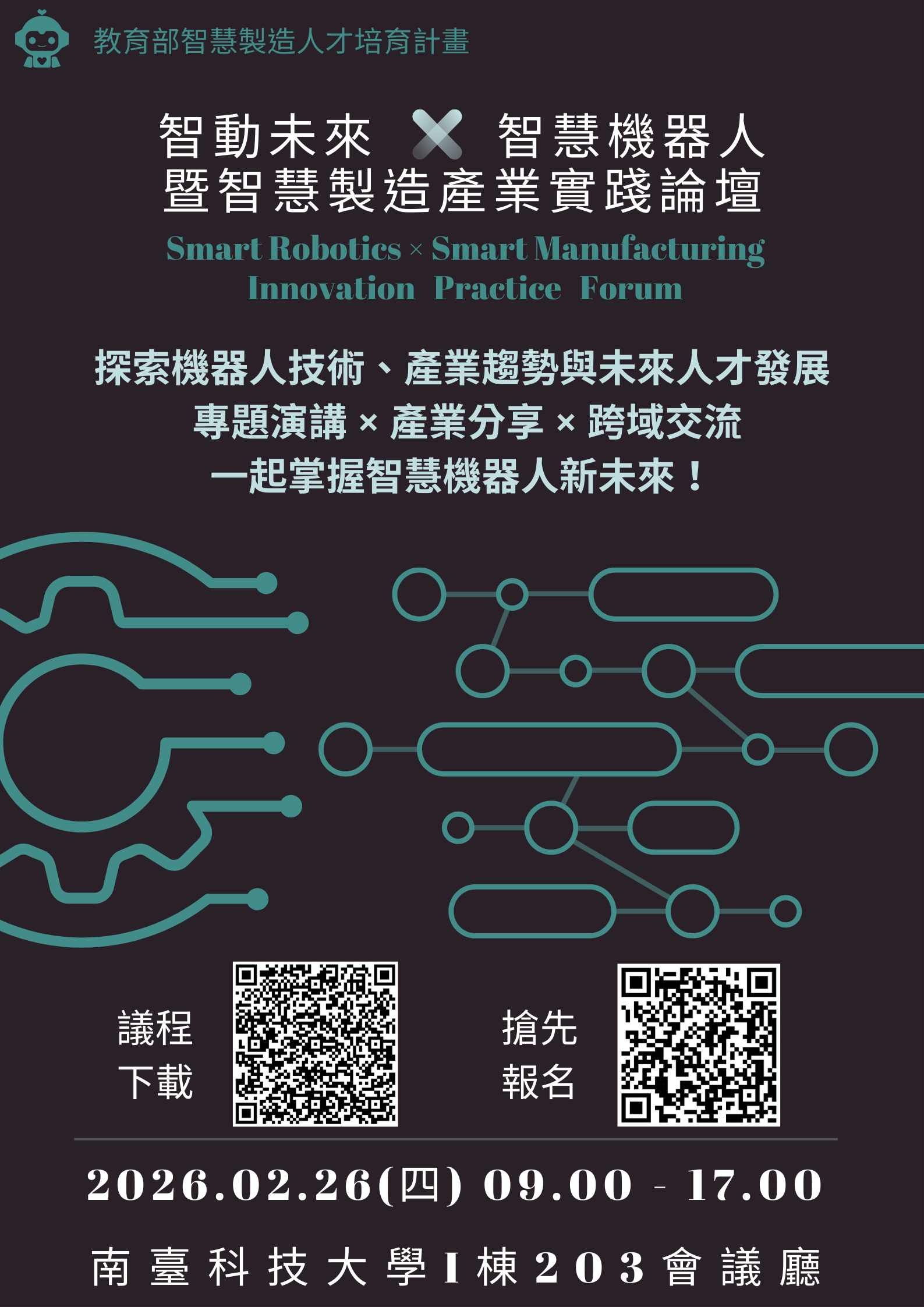 本計畫為教育部智慧製造人才培育計畫,將於115/2/26(四)9:00-16:30辦理【 智動未來X智慧機器人暨智慧製造產業實踐論壇 】活動,本次論壇將邀請廠商到場演講分享及成果展示。